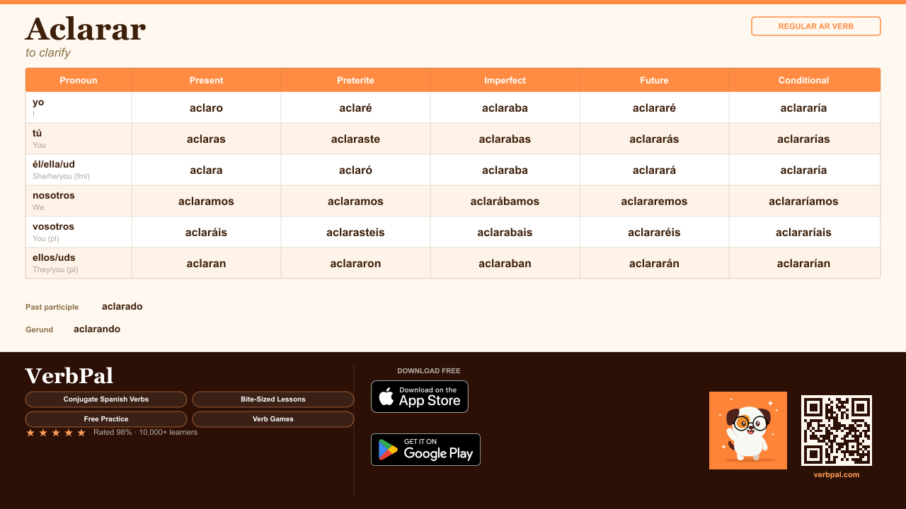 VerbPal drills "aclarar" in real Spanish sentences using spaced repetition.