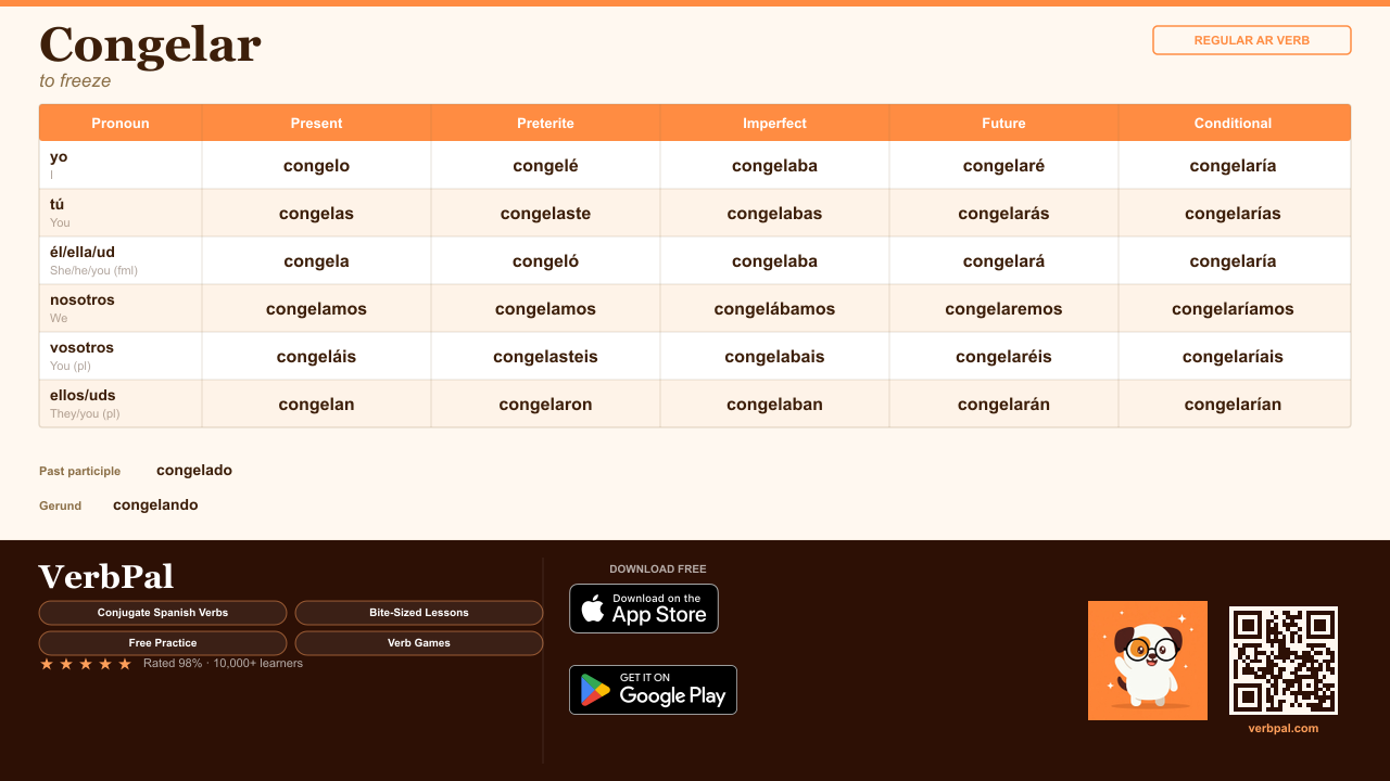 The Spanish verb "congelar" means "to freeze" in English. It is a regular verb. Below you'll find the complete conjugation tables for "congelar" across all 5 tenses.