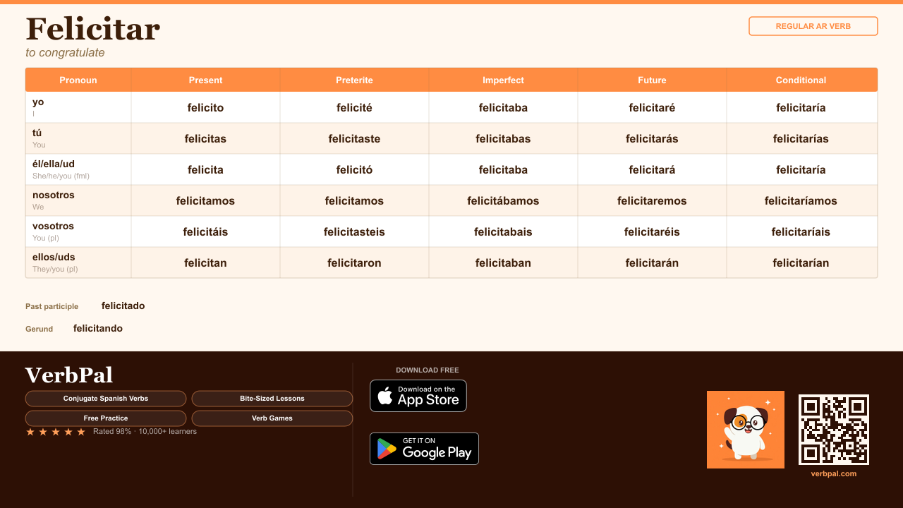 VerbPal drills "felicitar" in real Spanish sentences using spaced repetition.