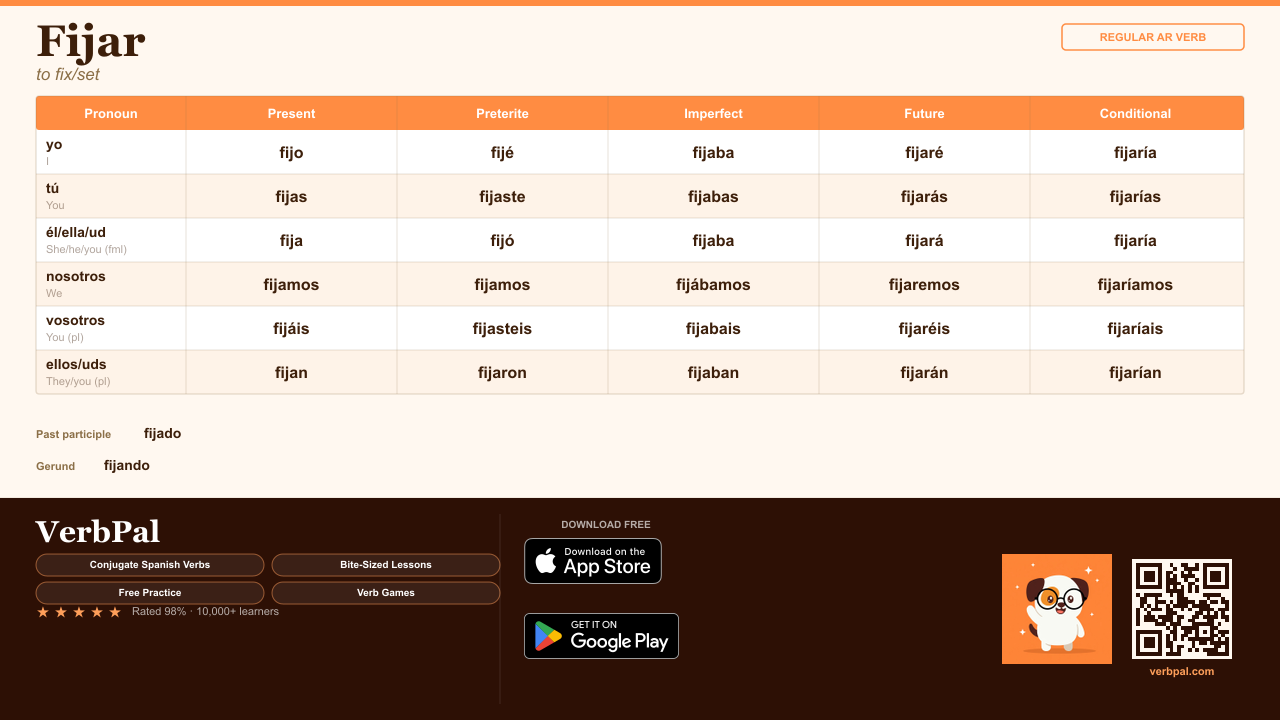 The Spanish verb "fijar" means "to fix/set" in English. It is a regular verb. Below you'll find the complete conjugation tables for "fijar" across all 5 tenses.