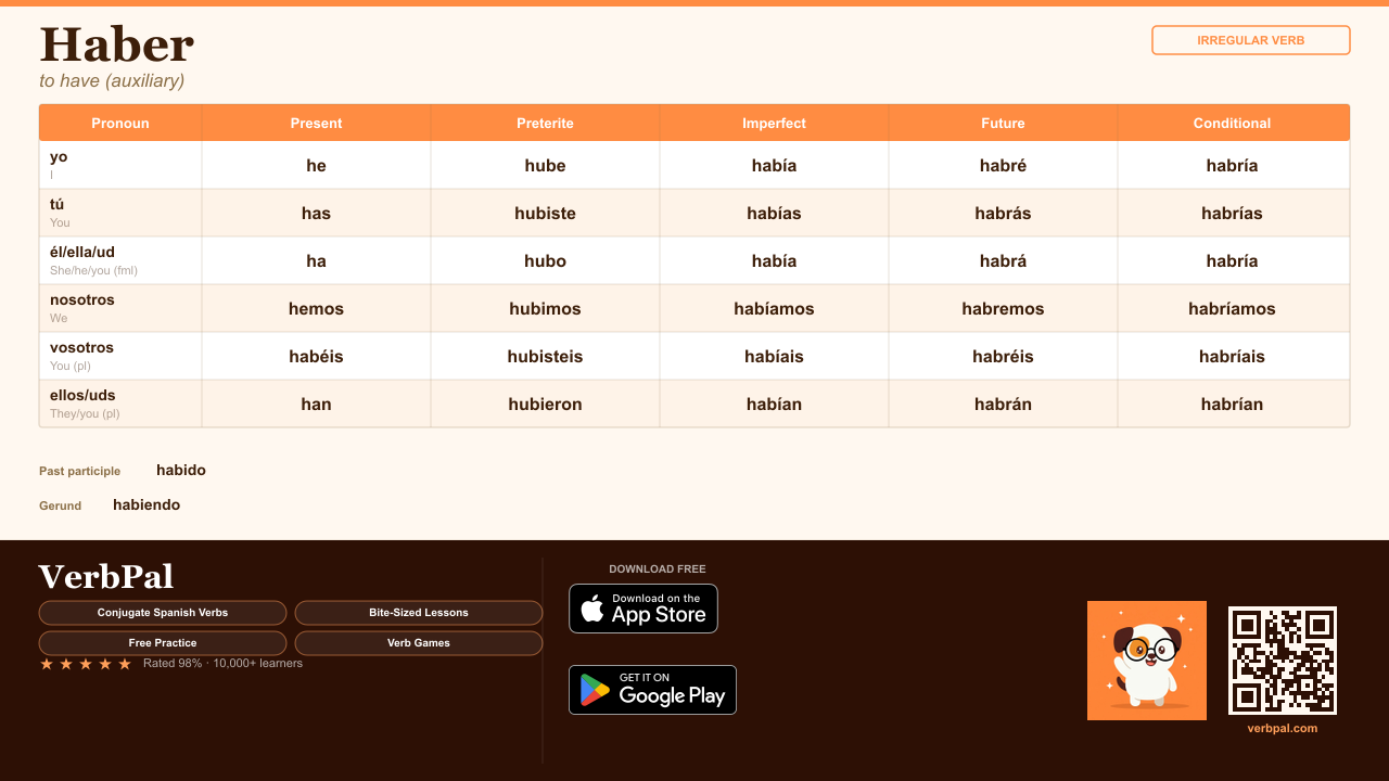 VerbPal drills "haber" in real Spanish sentences using spaced repetition.