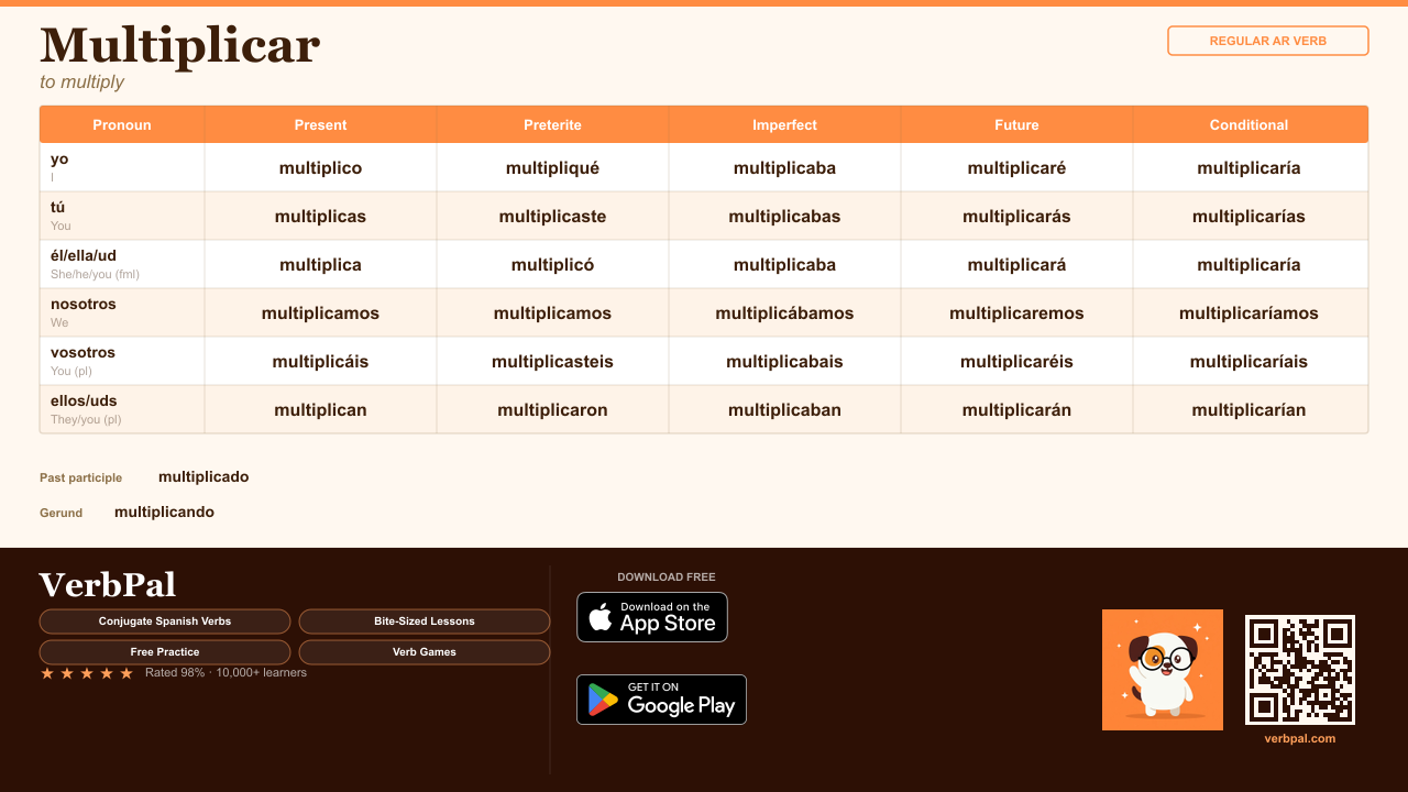 The Spanish verb "multiplicar" means "to multiply" in English. It is a regular verb. Below you'll find the complete conjugation tables for "multiplicar" across all 5 tenses.